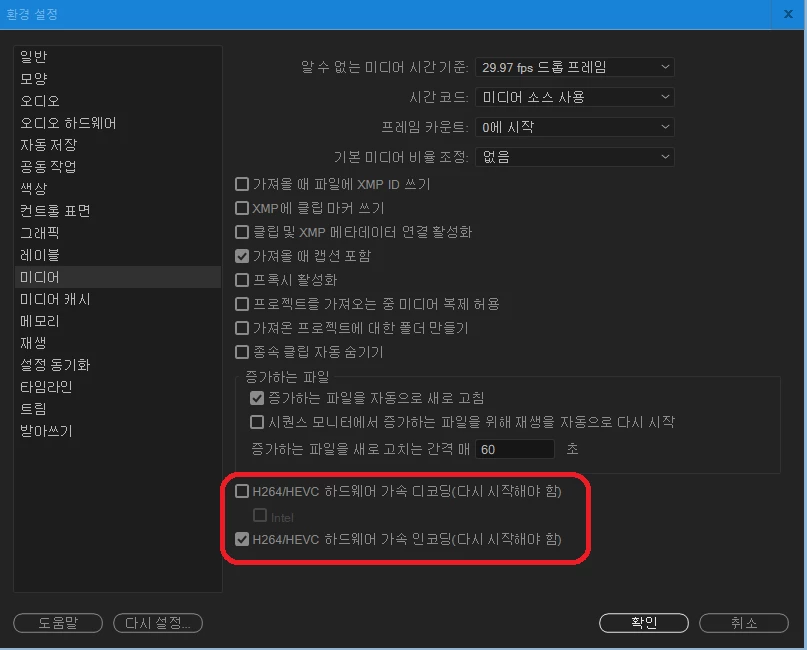 편집 > 환경설정 > 미디어 > [H264/HEVC 하드웨어 가속 디코딩(다시 시작해야 함)], [H264/HEVC 하드웨어 가속 인코딩(다시 시작해야 함)]  체크 해제 > 프리미어 프로 종료 재시작