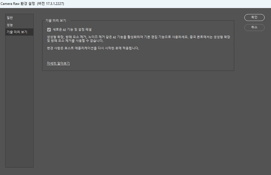 카메라 로우 환경설정에서 기술 미리보기 새로운 Ai 기능및 패널이 체크되어 있으실까요?