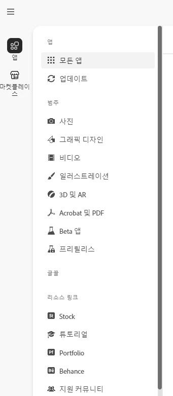앱, 마켓플레이스 이 두개만 남고 다 사라져있어요.