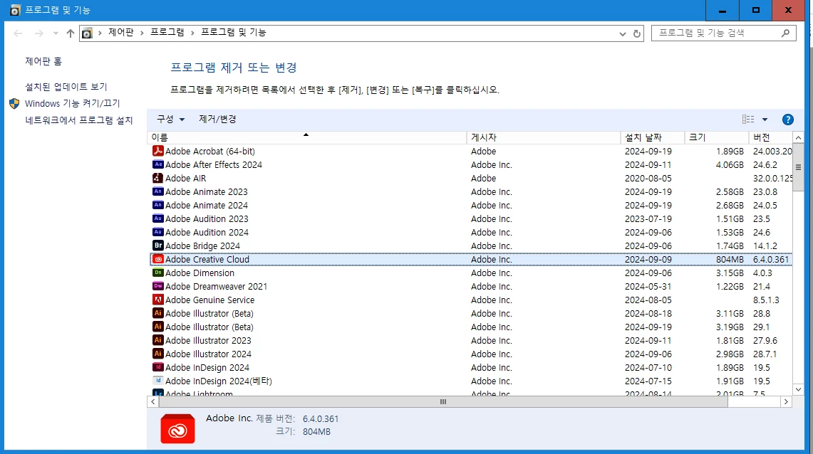 제어판 > 프로그램 제거 > creative cloud에서 우클릭 > 복구 클릭을 진행해보세요