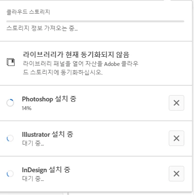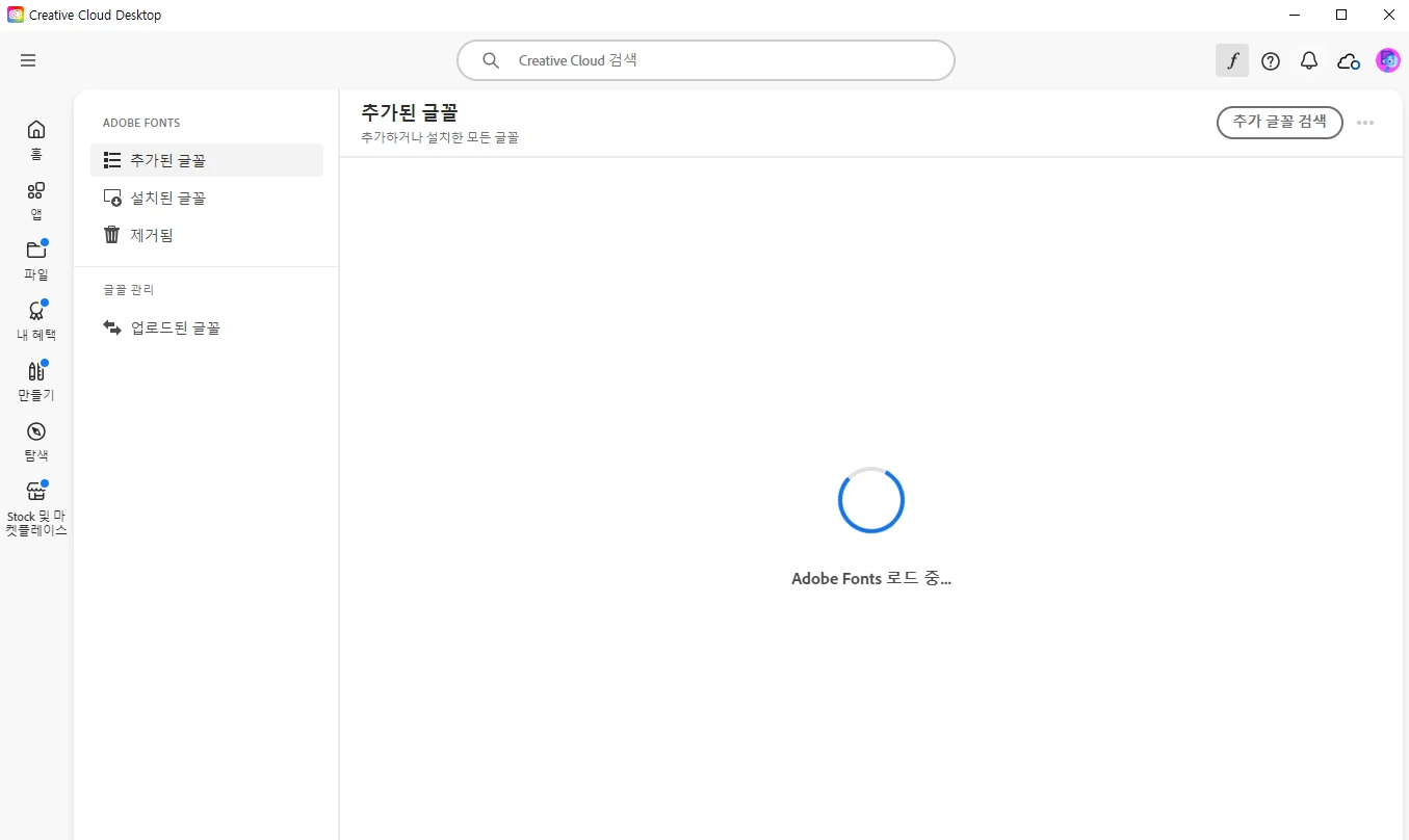 어도비 폰트만 동기화가 된다면 좋을 것 같습니다. 크리에이티브 클라우드에서 어도비 폰트가 무한 로딩되며 인식이 되지 않습니다. 분명 어도비 폰트 사이트를 들어가서 확인해보면 제가 다운로드 받았던 어도비 패밀리 폰트들은 설치가 되어있어 [제거] 버튼이 나옵니다. 없다면 [설치] 버튼 부터 나와야 겠지요..
