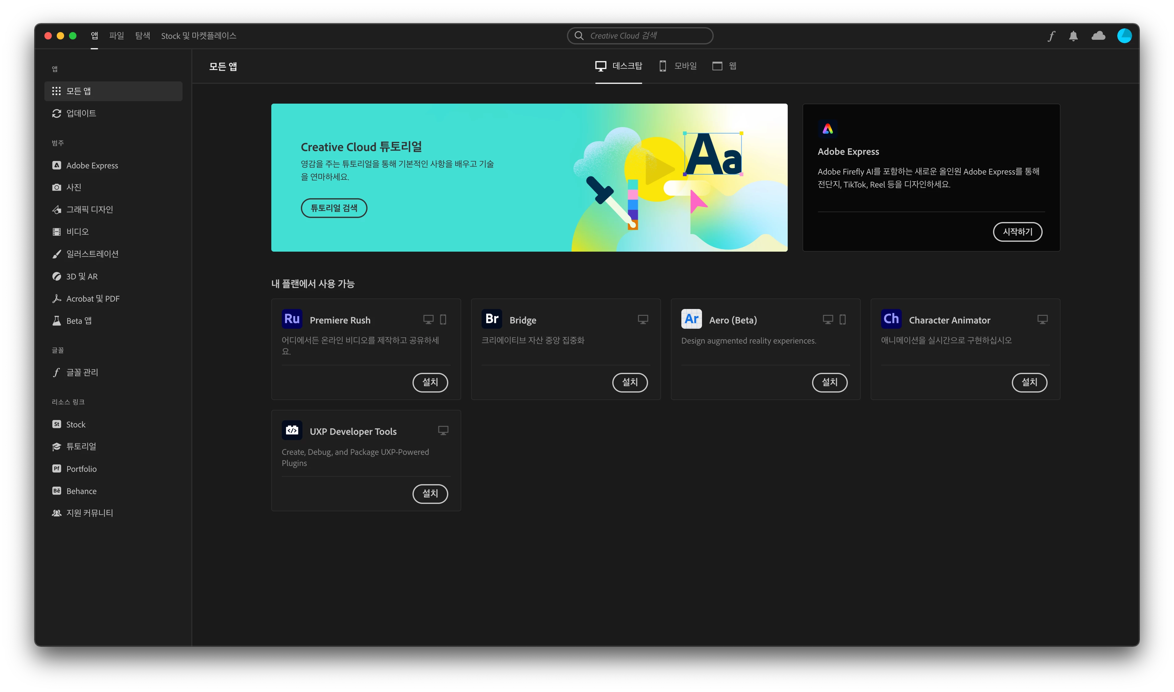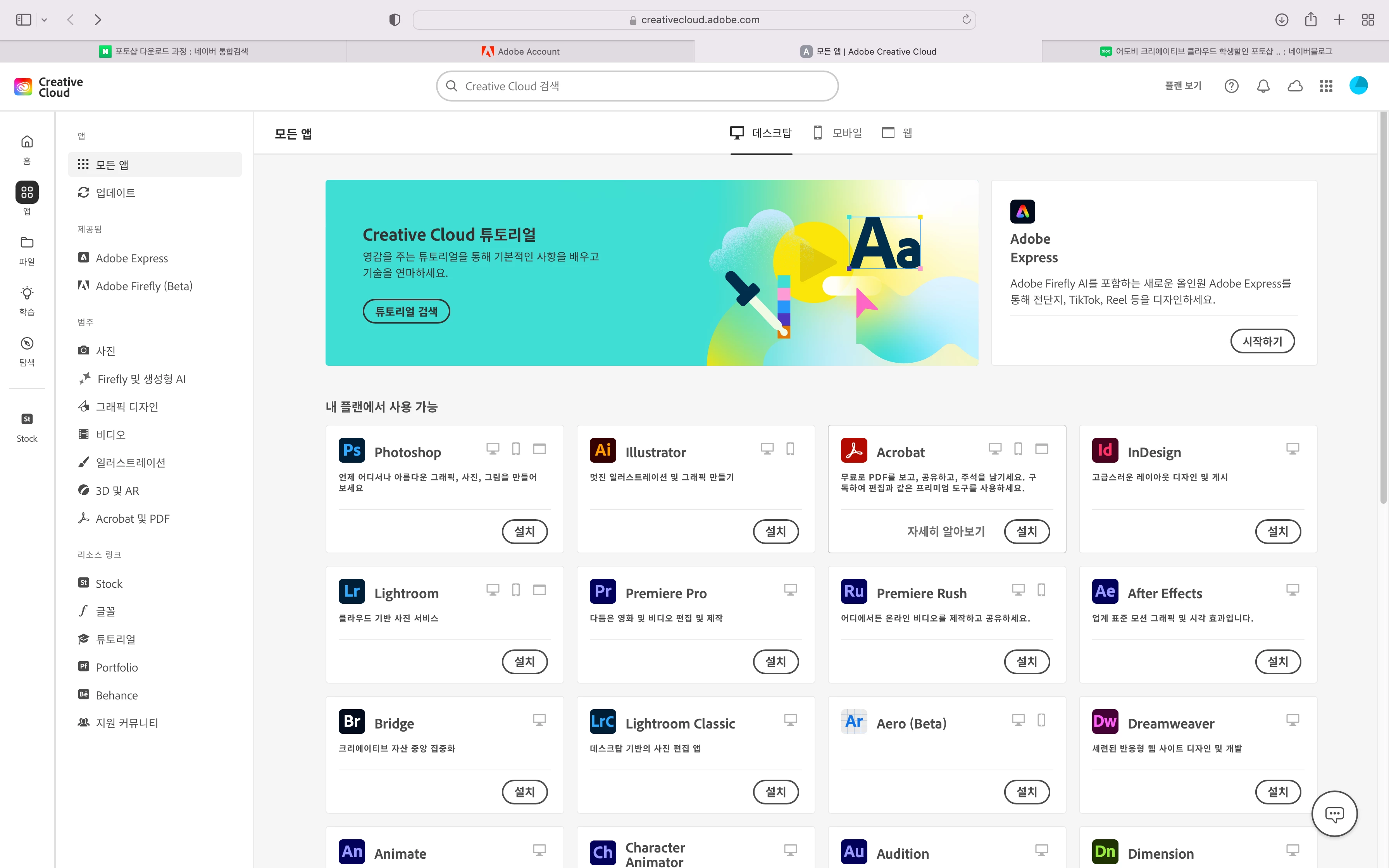 크리에이티브 클라우드 앱에 앱 설치가 뜨지 않음