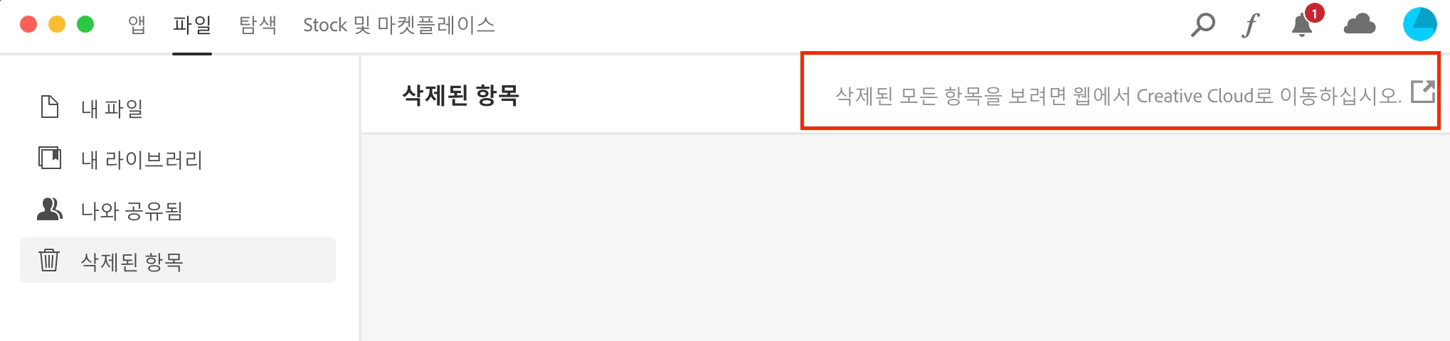 1.크리에이티브 클라우드 앱 실행 -> 파일 탭 -> '삭제된 모든 항목을 보려면 웹에서 creative cloud로 이동하십시오' 클릭