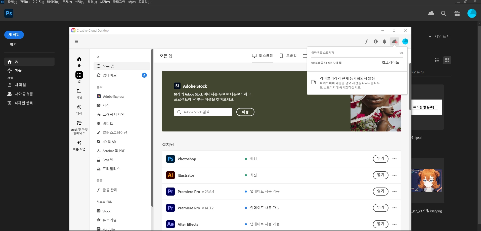 포토샵을 실행하면 늘 이 화면입니다 그리고 동기화엔 느낌표 표시가 있어요 처음엔 동기화 문제인가 싶어 이것저것 해보고 라이브러리에 저장해둔 파일들도 따로 저장한 뒤 모두 삭제해봤지만 문제 해결이 되진 않았습니다 설정에서 "로그인 시 클라우드 실행" 도 꺼놨고 이것저것 꺼놨지만 문제 해결엔 도움이 되지 않았어요 이와 비슷한 해외 글을 찾아봤지만 그 글에선 클라우드 파일 이름을 변경했다고 나오더군요 근데 이게 경로 변경인지 이름 변경인지 명확하지 않아서 둘 다 해보니 둘 다 크리에이티브 클라우드를 실행할 수 없는 결과를 불러왔습니다 3달째 괴로워하다 해결법이 있을 거 같아 글 남겨봅니다 도와주세요..