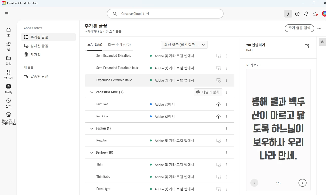 그리고 일단 크리에이티브 클라우드 데스크톱에서 해당 폰트를 패밀리 설치를 하단에 이미지처럼 확인후 패밀리 설치가 안되어 있다면 패밀리설치 진행후 확인을 해볼 수 있으며,