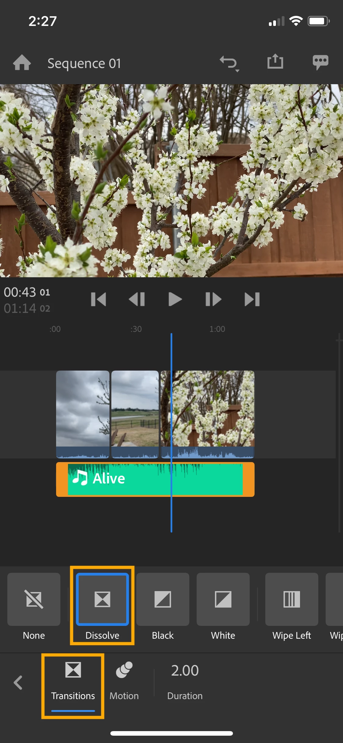 1. 전환 효과를 적용할 클립을 선택합니다. 선택된 클립은 오렌지색 테두리가 표시됩니다.