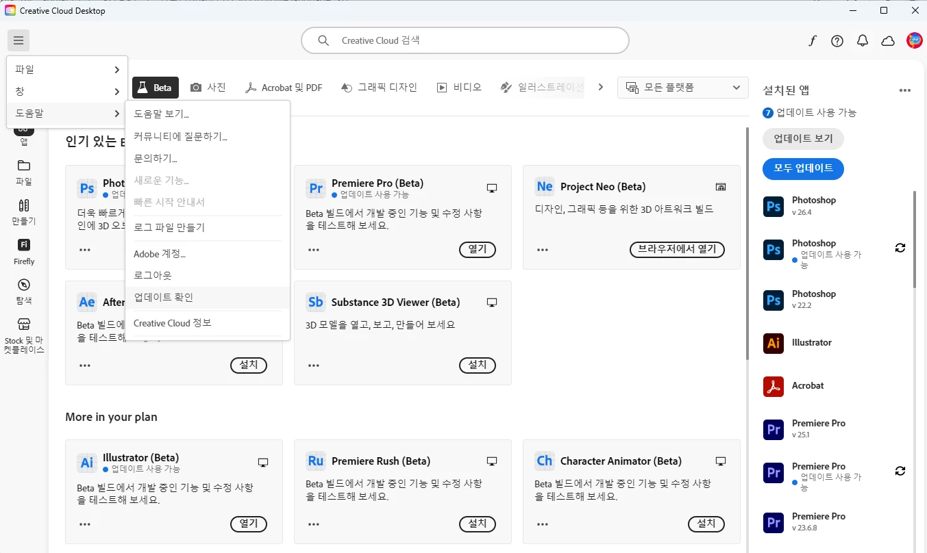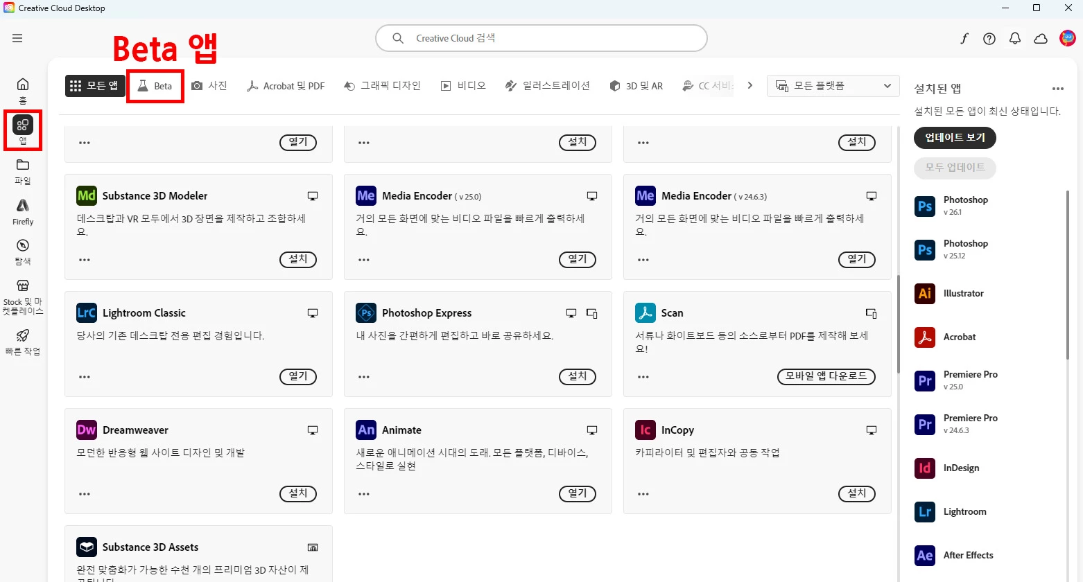 베타버전을 설치하려면 일단 최신버전의 크리에이티브 클라우드를 구동하셔야 하는데