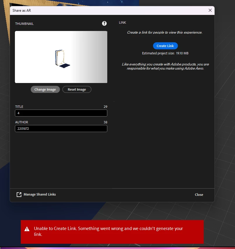 adobe aero에서 create link 오류
