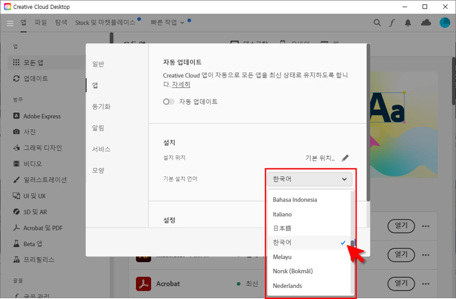 A. Adobe 프로그램의 언어는 기본적으로 제품 설치 전 Creative Cloud에서 사용하고자 하는 언어로 설정 후 설치를 진행해 주셔야 합니다.
