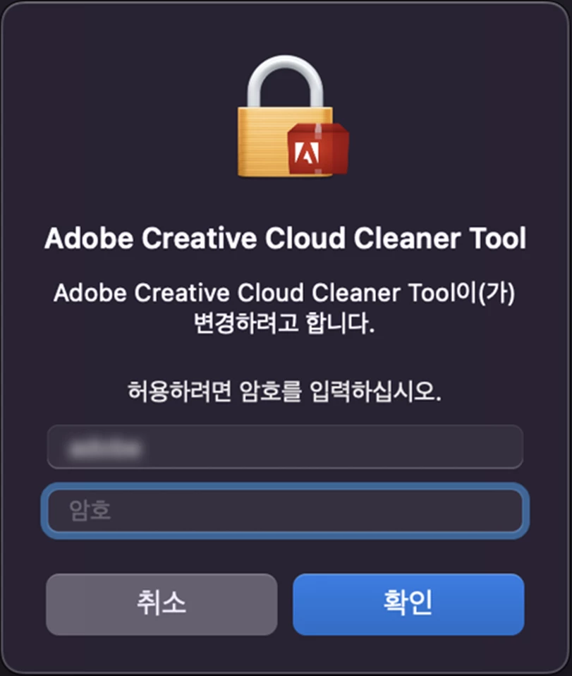 해당 메시지는 사용하시는 MacOS의 사용자 암호를 입력 후 “계속” 또는 “확인”을 눌러주시면 Adobe 프로그램의 설치가 진행됩니다.