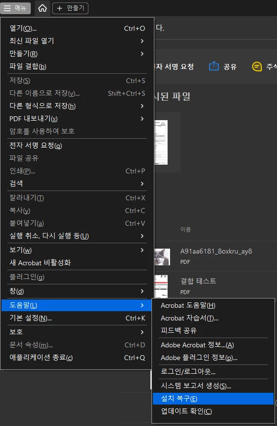 일단 아크로벳의 좌상단의 메뉴 > 도움말 > 설치복구를 진행하시거나 아크로 클리너를 통해 아크로벳을 삭제후 재설치를 진행해 보는 방법이 있습니다.
