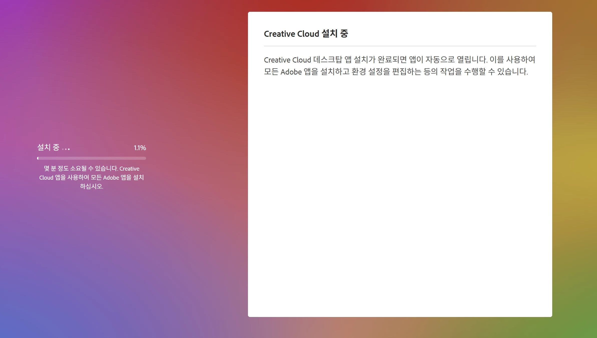 creative cloud 다운받고 setup.exe 엔터치면 첫번째 화면처럼 설치하고 있다 뜨고 두번째 사진으로 넘어가고 나면 그 이후론 화면은 꺼지고 앱은 안 깔립니다 컴퓨터 껏다 켜보기도 하고 몇번을 다운받아봤는데도 전혀 안 깔리네요reative cloud 다운받고 setup.exe 엔터치면 첫번째 화면처럼 설치하고 있다 뜨고 두번째 사진으로 넘어가고 나면 그 이후론 화면은 꺼지고 앱은 안 깔립니다 컴퓨터 껏다 켜보기도 하고 몇번을 다운받아봤는데도 전혀 안 깔리네요... 윈도우11이고 올해  나온 노트북으로 산거라 문제 삼을만한게 없는데 대체 왜 이러는걸까요...