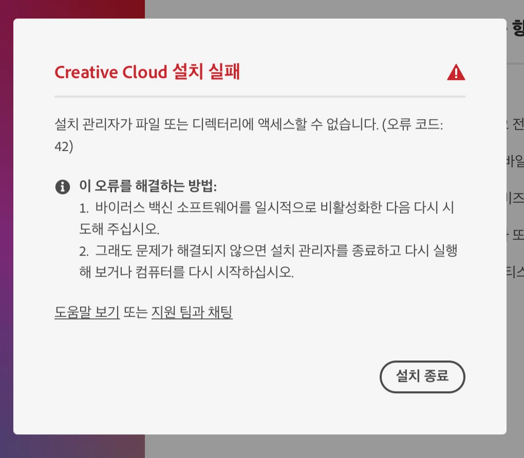 Creative Cloud 설치 실패 오류 관련 문의 (오류 코드 : 42)
