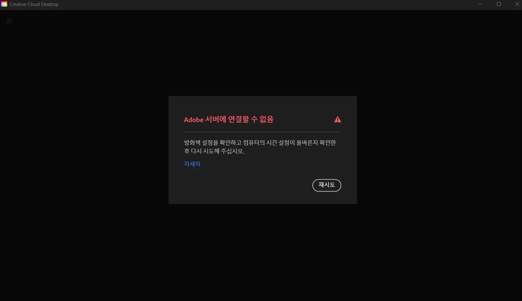 Creative cloud 초기화중 무한로딩/서버에 연결할 수 없음 방화벽 및 시간확인 알림창