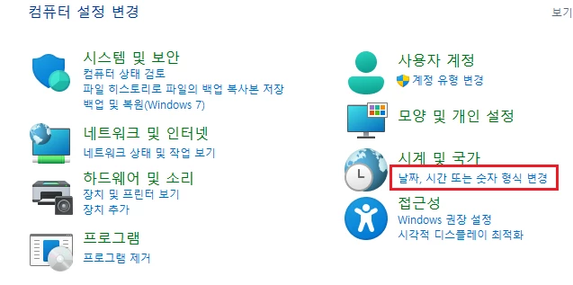 제어판에서 "날짜, 시간 또는 숫자 형식 변경" 을 클릭합니다.
