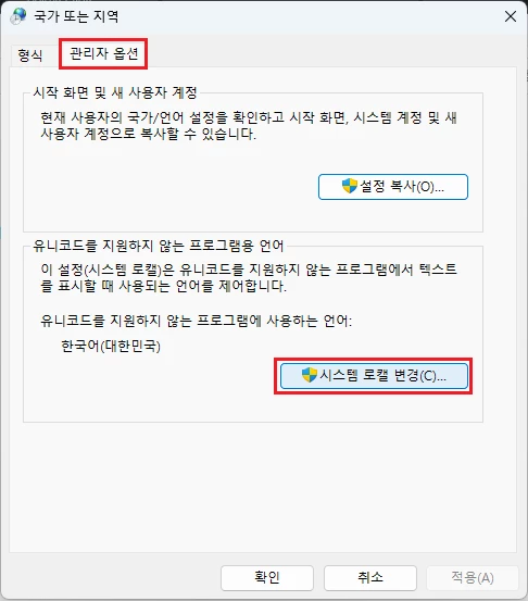 "관리자 옵션" 탭에서 "시스템 로캘 변경"을 눌러주세요.