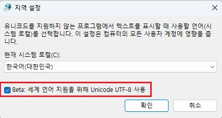 "Beta: 세계 언어 지원을 위해 Unicode UTF-8 사용"체크하고 확인을 누른 후 재부팅합니다.
