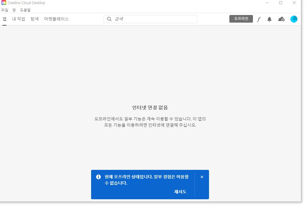 인터넷이 연결되어 있는 상태임에도 Creative Cloud Desktop 실행시