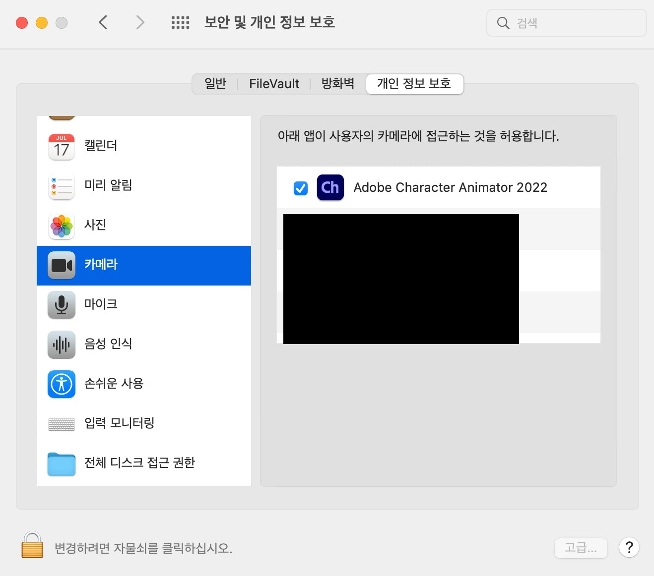 아... 간단하게 해결 했네요 카메라 및 마이크 몇에 세줄에서 카메라 설정을 바꿨습니다 ;;;