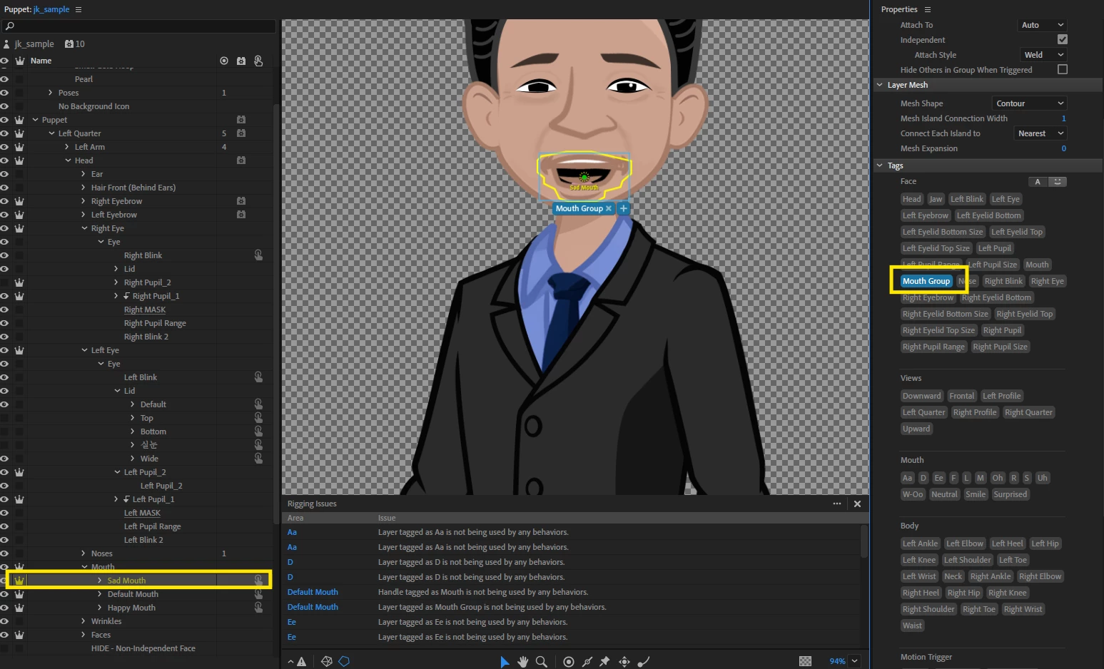 이 문제를 해결하기 위해 'Mouth' 그룹의 레이어를 삭제하고