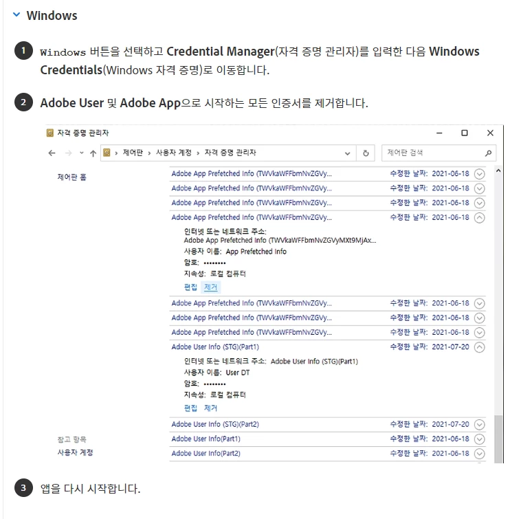 로그인이 바르게 되어있다면, 다음 문서를 참고해 Adobe User 및 Adobe App 인증서 제거를 진행해 보세요.