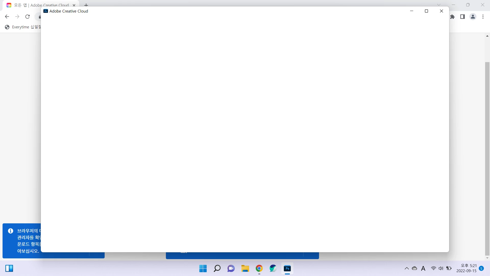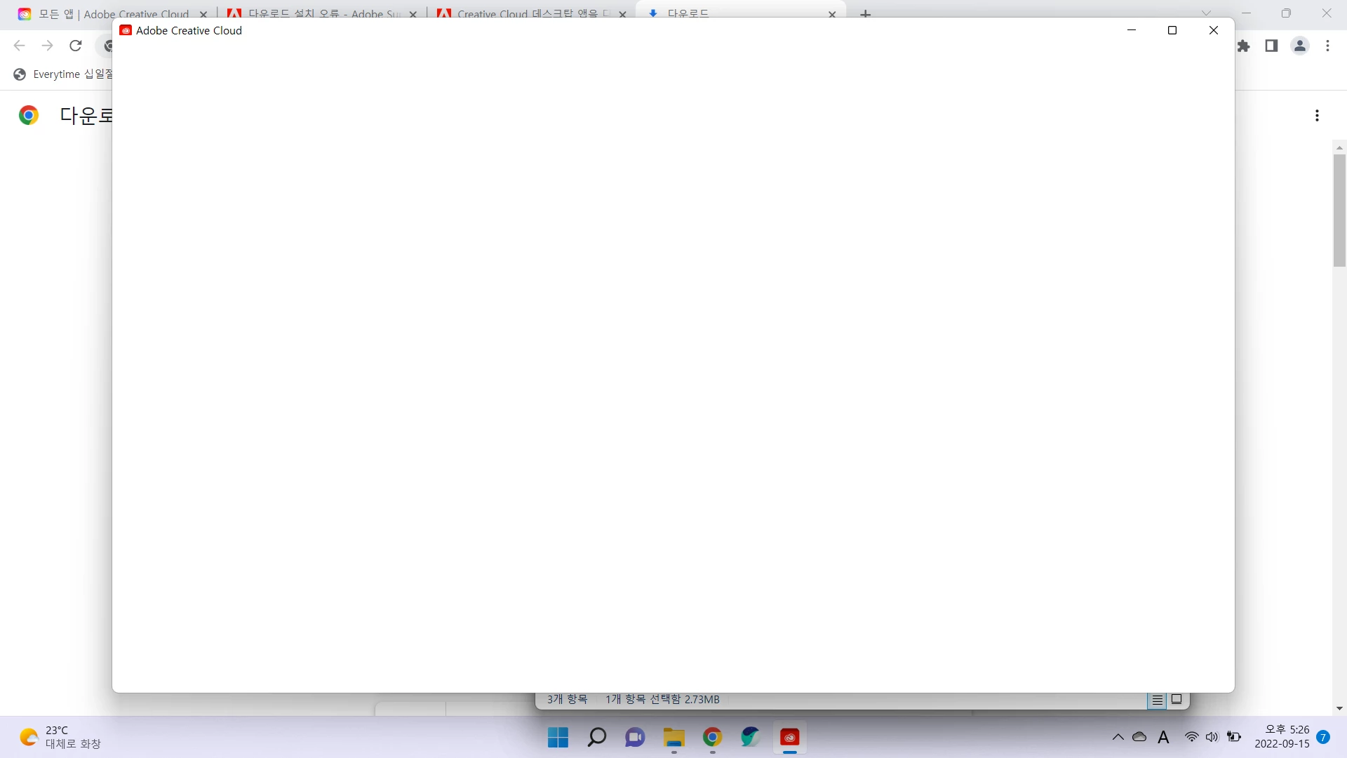 포토샵 관련 모든 어도비 프로그램이 설치가 안되요ㅠㅠ 다운로드까지는 진행이 되고 파일 탐색기에서 실행을 하려고 하면 이렇게 흰색 화면이 뜨고 실행이 안되네요. 여러 가지 방법으로 다 진행해 봤는데 먹히질 않아요. 방화벽도 제거해 보고,, 왜 이러는 걸까요? 어도비 포토샵을 첨 다운로드인데 답답하네요