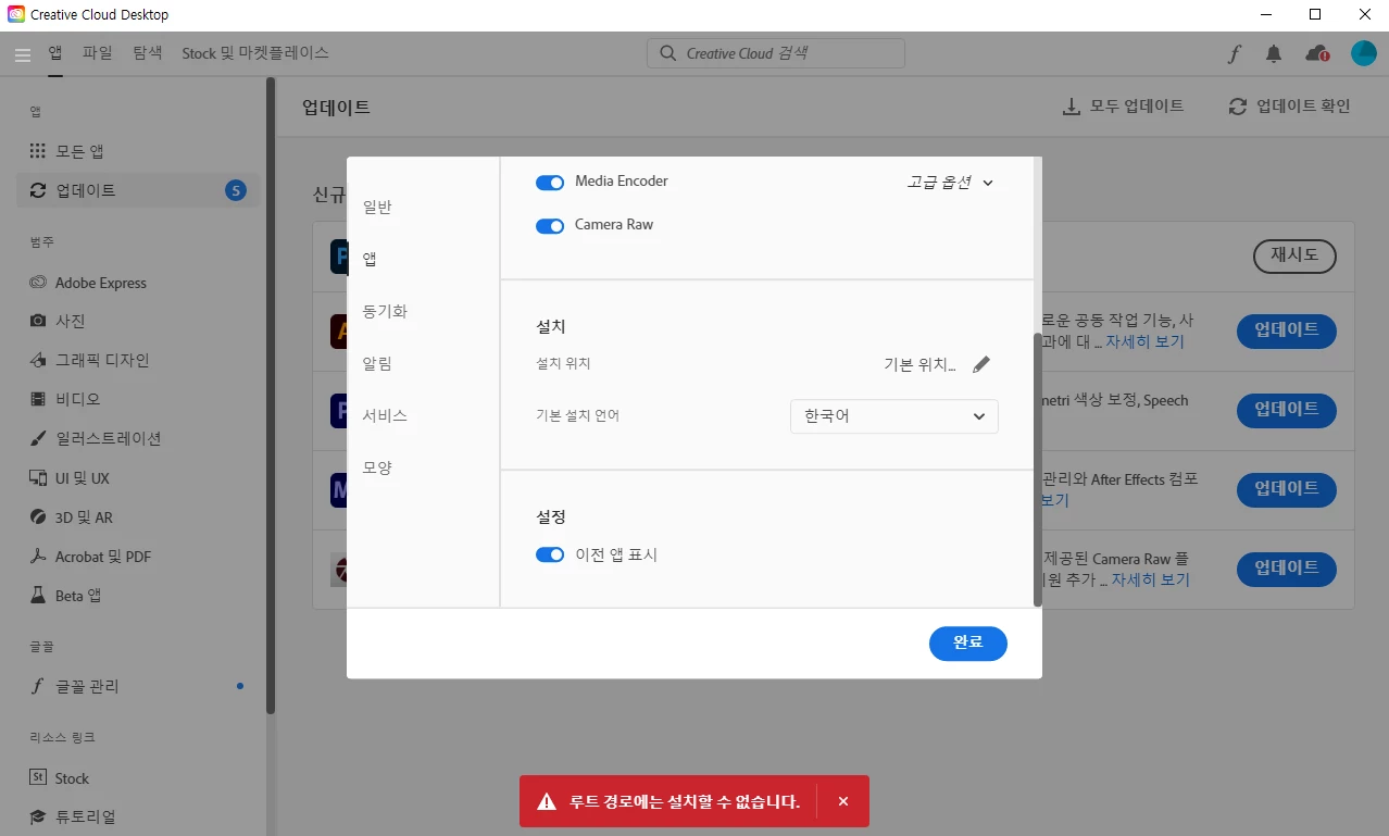 저기 사진 속 설치위치 변경을 누르고, D 혹은 E를 누르면 '루트 경로에는 설치할 수 없습니다.' 라고 뜹니다.