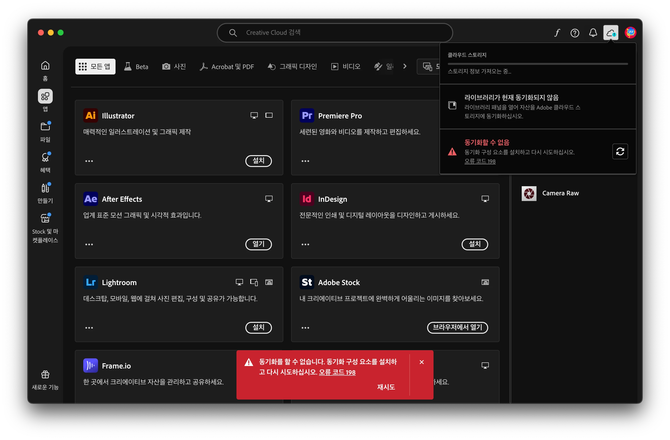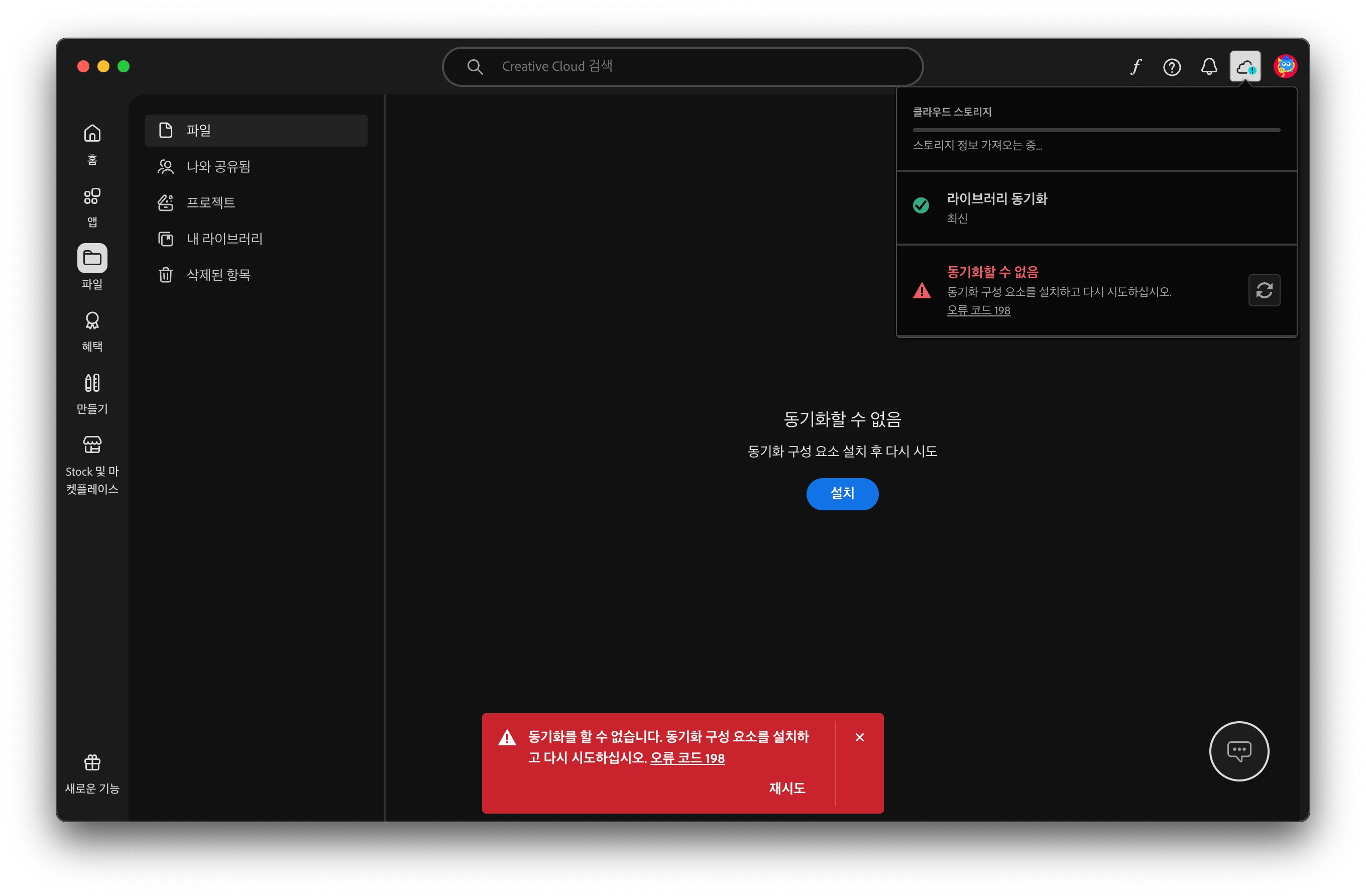 Can't sync - error 198 - install synchronisation component - creative cloud