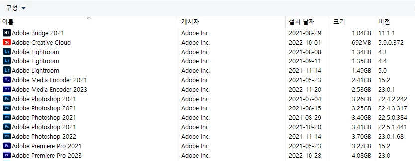 이전버전 포토샵과 라룸, 프리미어를 삭제하고 싶은데 삭제가 안 됩니다