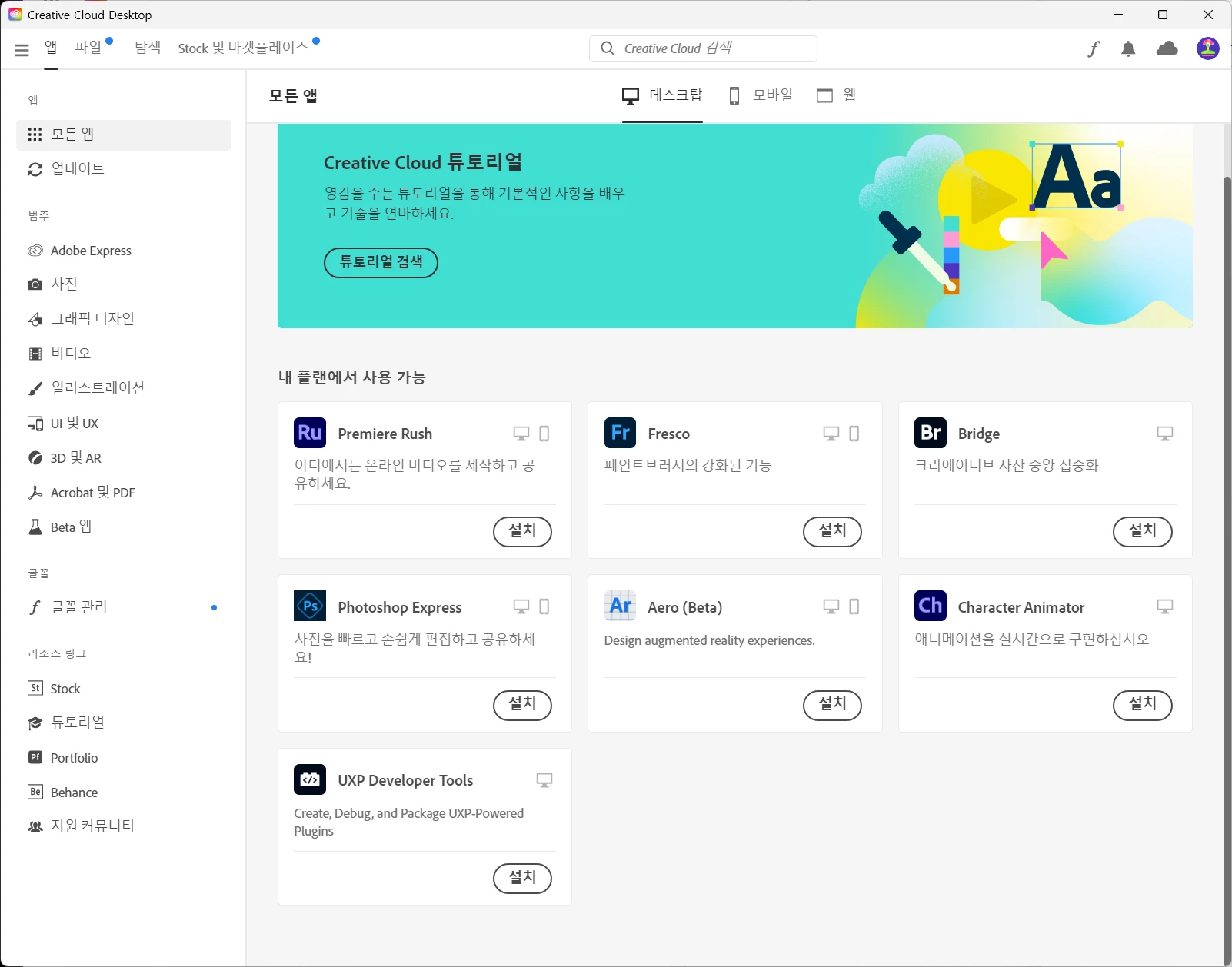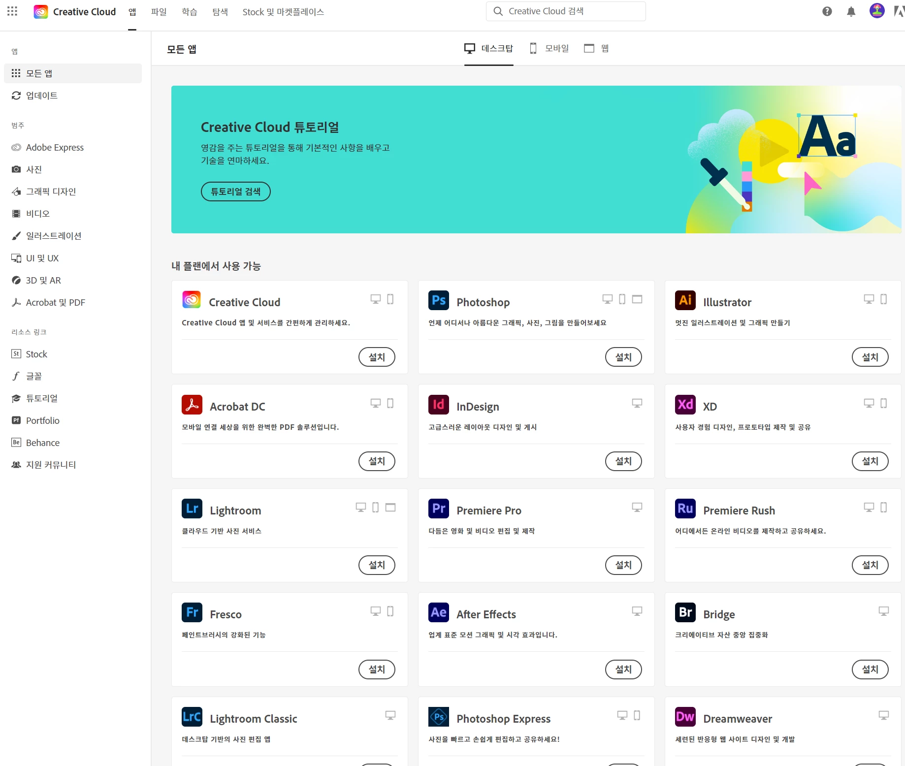 크리에이티브 클라우드의 웹 버전과 데스크탑 버전에서 보이는 사용가능 앱이 다르며 설치 안됨