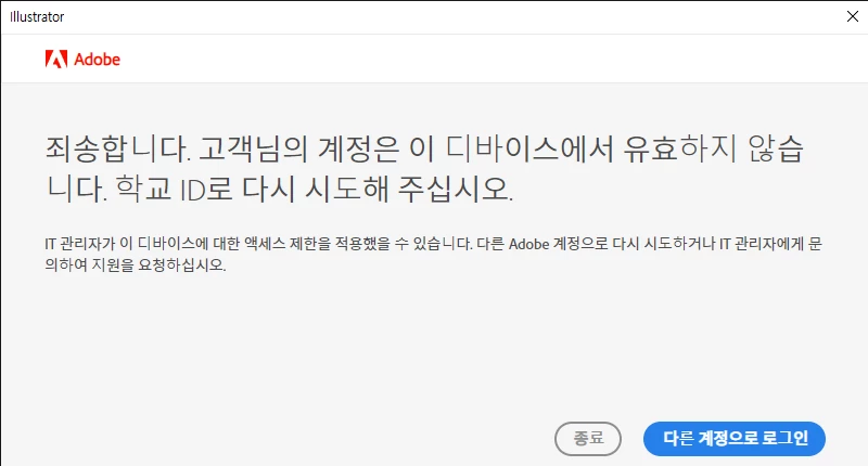 그 전에는 학교에서 지원받아 사용을 했었고 이번에는 지원을 받을 수 없게 되어서 직접 구매해서 사용하려 했더니 이처럼 뜨면서 계속 일러스트나 다른 앱이 실행이 안됩니다... 기존 컴퓨터에 파일을 삭제하여 재설치 해도 여전히 똑같이 뜹니다... 학교 ID도 탈퇴하였는데도 여전히요..
