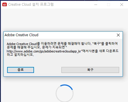 그래서 아예 삭제했다가 다시 깔려고 했는데, 제어판에서 삭제하려니 Adobe Creative Cloud를 사용하는 앱이 있어서(아마 포토샵과 일러스트레이터일 것으로 추정) 삭제가 불가능하다고 하고,