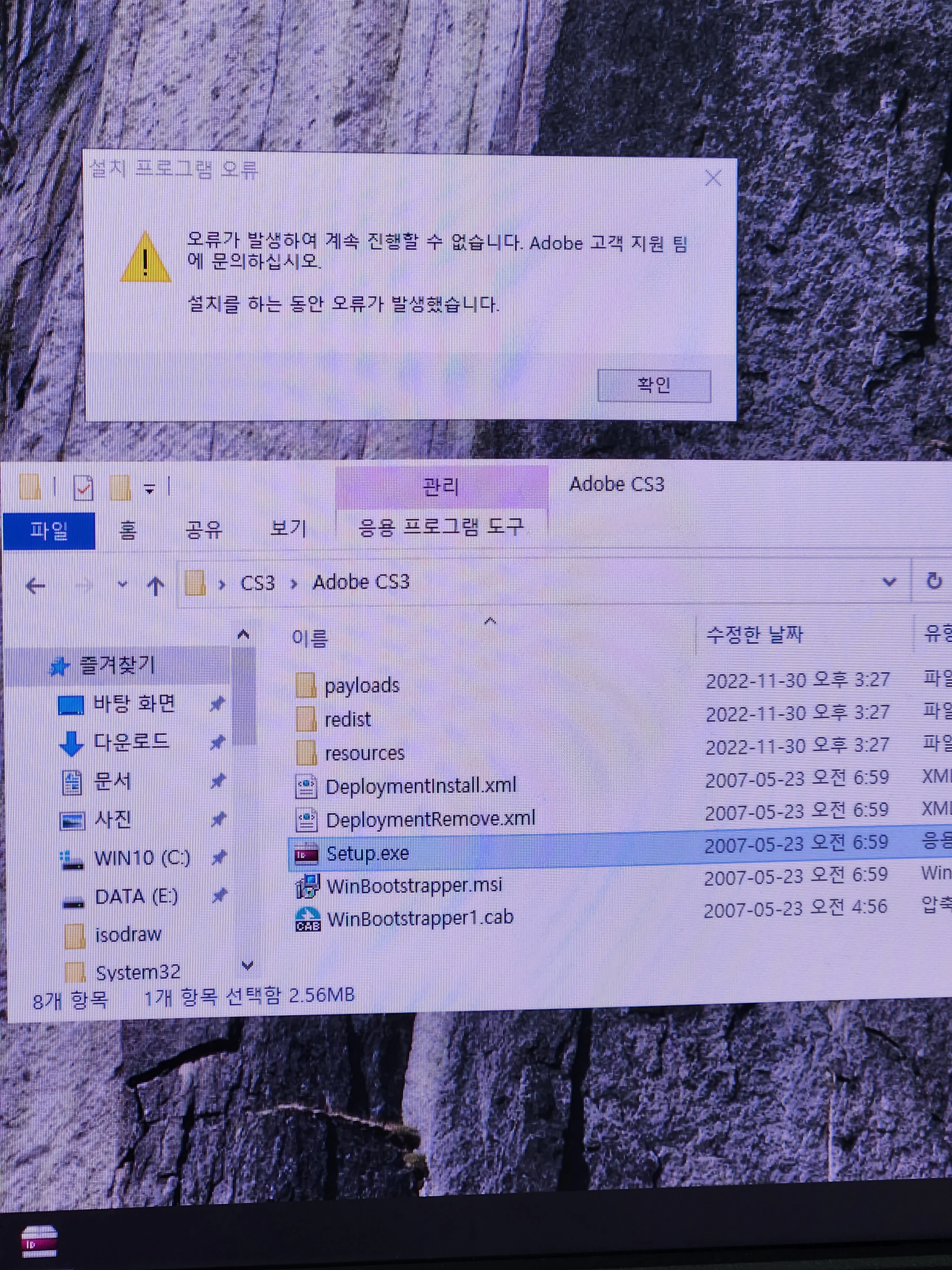CS3설치오류 문의입니다. 해결방법을 몰라 확인 한번 부탁드립니다..