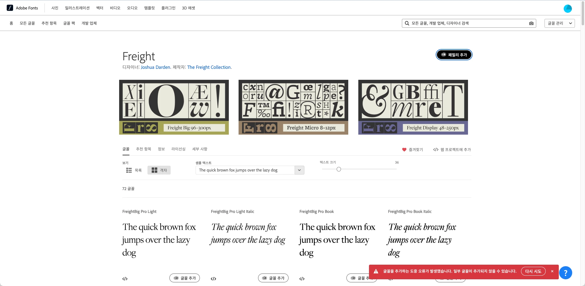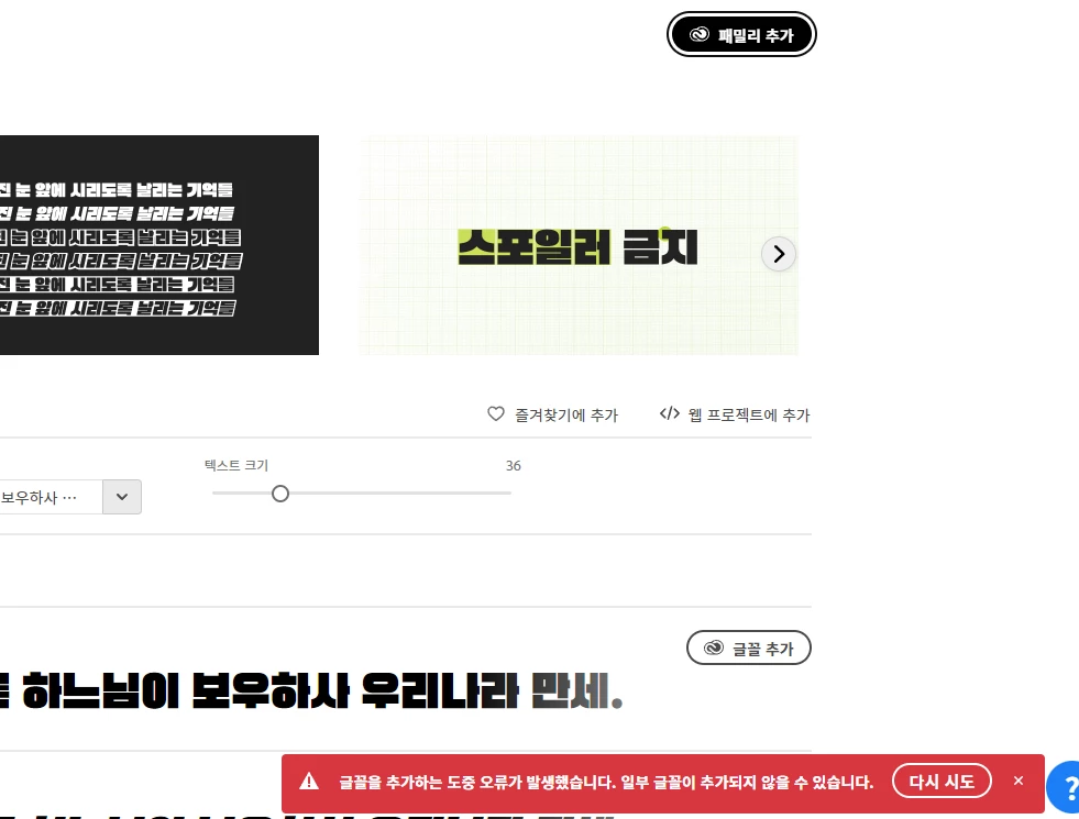 패밀리 추가 - 글꼴을 추가하는 도중 오류가 발생했습니다. 일부 글꼴이 추가되지 않을 수 있습니다.