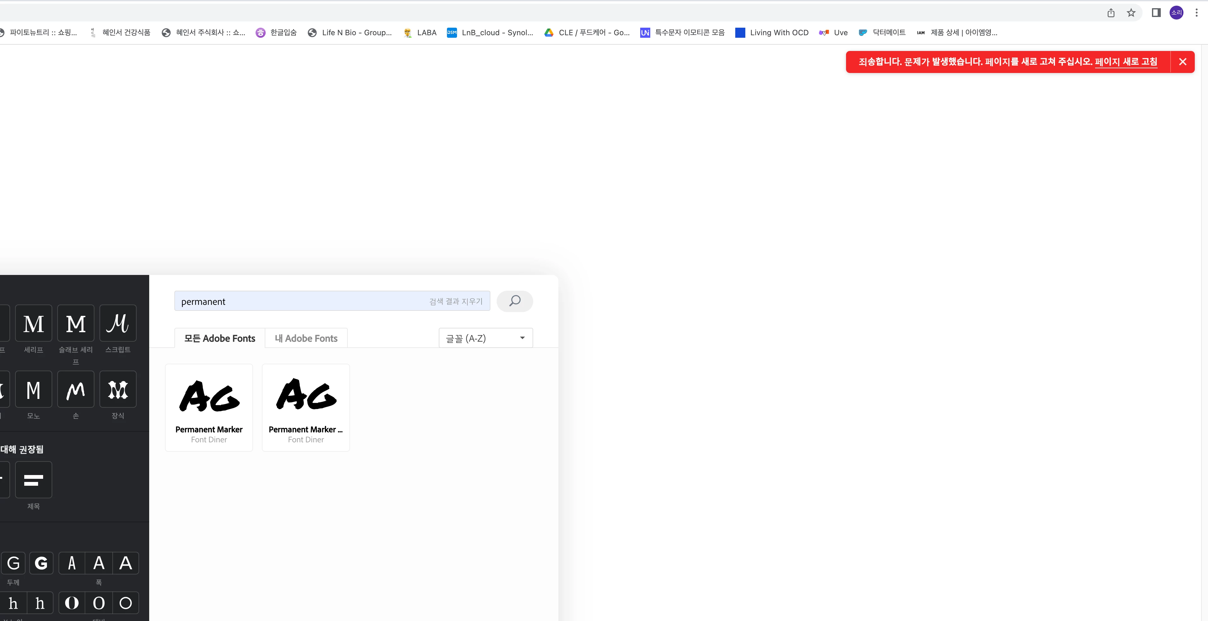소소리23309011z15uParticipantForum|Forum|3 years agoNovember 11, 2022Question어도비 포트폴리오와 폰트 연동 오류Forum|Forum|3 years agoNovember 11, 20223 replies2663 views 어도비 포트폴리오 페이지 수정 중 텍스트 폰트를 어도비 폰트에서 연동하는 기능이 실행되지 않습니다. '죄송합니다 페이지를 새로고침해주세요'라는 안내만 뜨고 아무런 액션이 없습니다. 해결방안을 아시는 분이 있으실까요