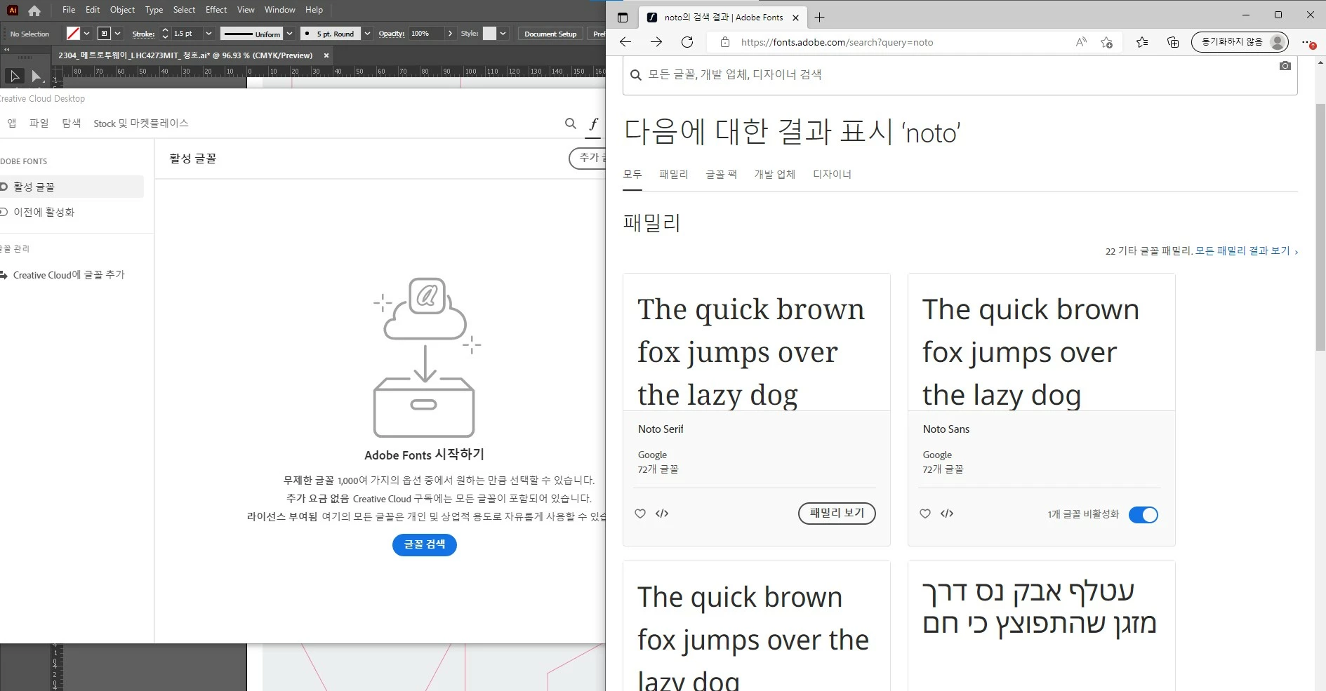 프로그램을 켜면 유실이 되고, Creative Cloud App에도 활성글꼴에 폰트가 뜨질 않습니다.