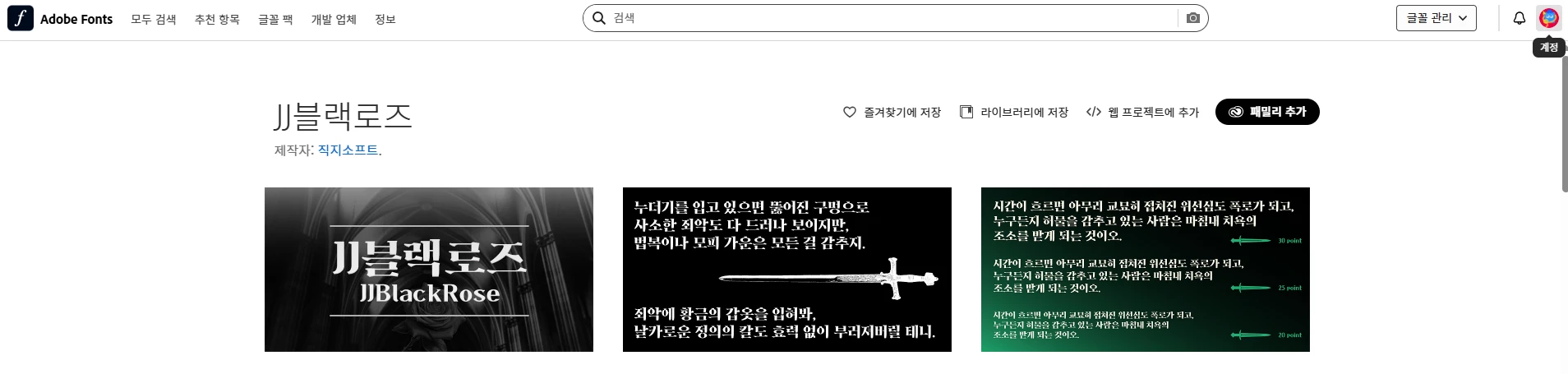 Adobe Fonts 기업용 계정 사용 중인데, 폰트 패밀리 추가가 뜨지 않고 'cc와 함께 사용 가능'이라고만 확인됩니다.