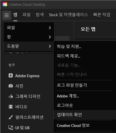 2. 도움말 메뉴를 통해 업데이트를 해주세요.
