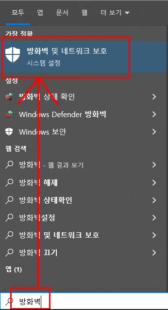 1-1. 왼쪽 하단 검색바에서 [방화벽] 검색합니다.