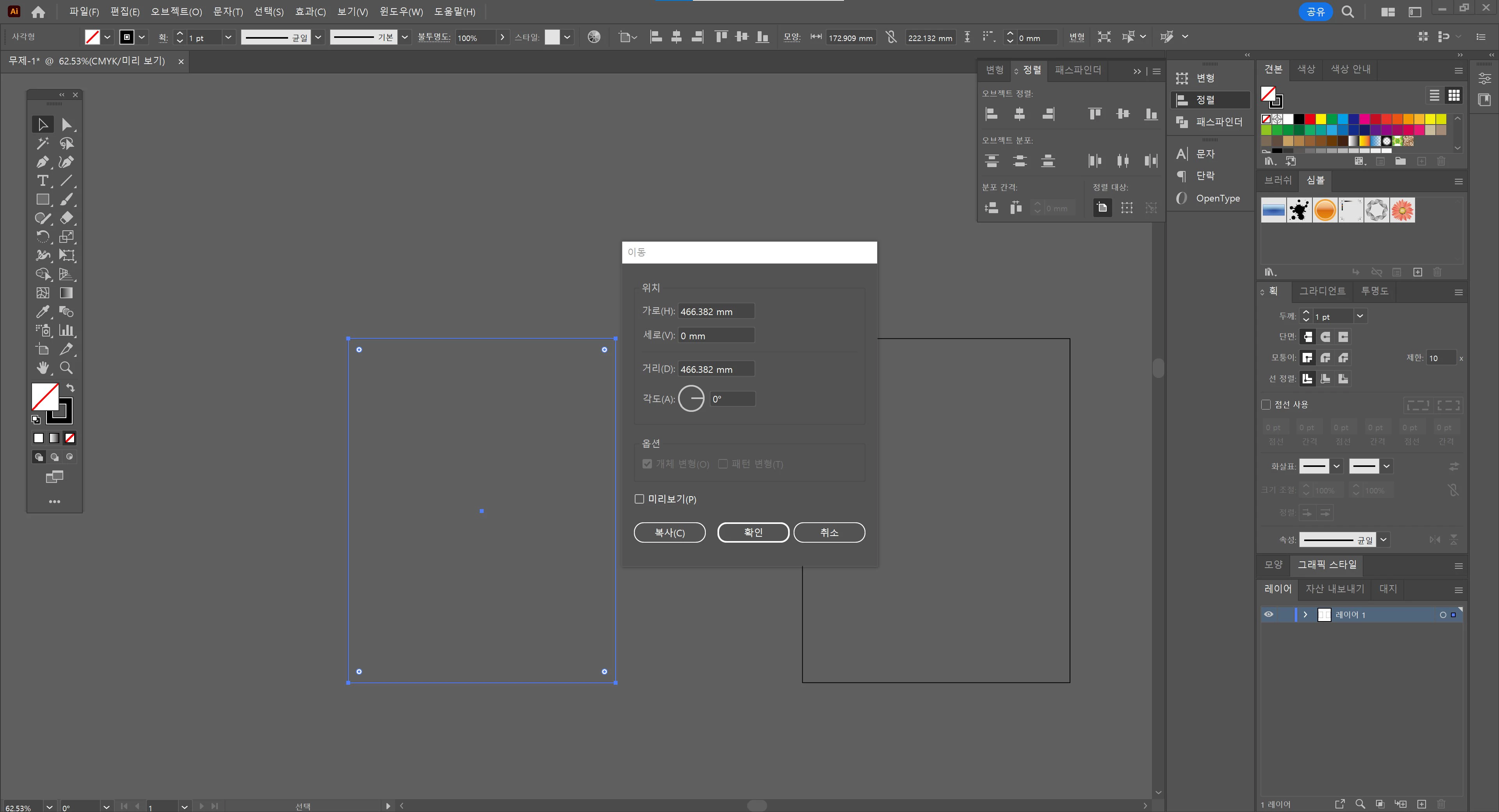 개체간 직선거리를 수치로 입력해서 이동시켜 정확하게 겹치게 정렬합니다.