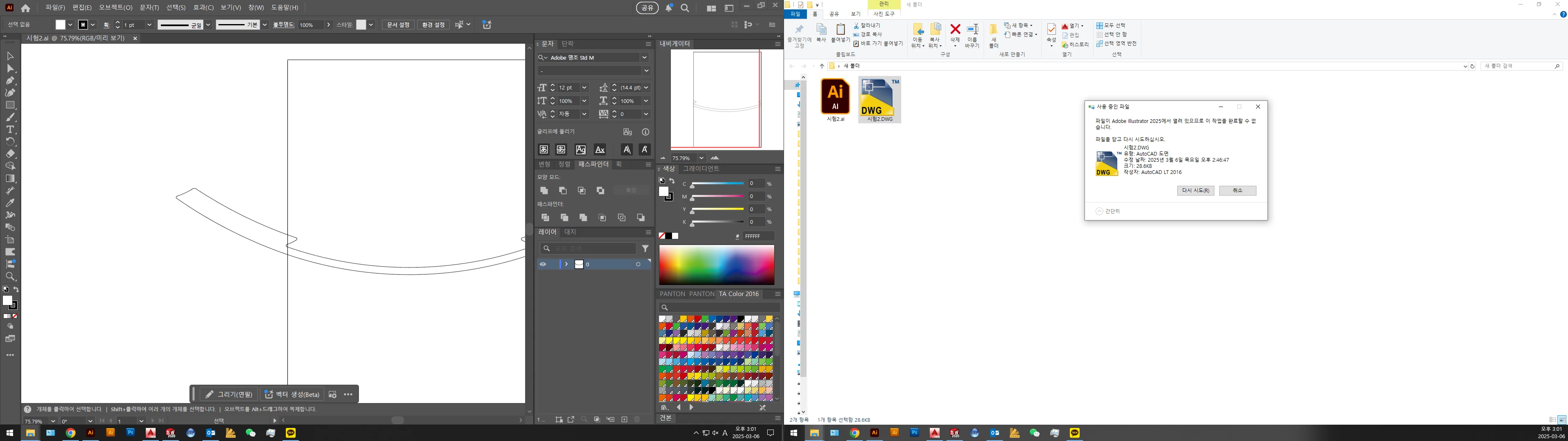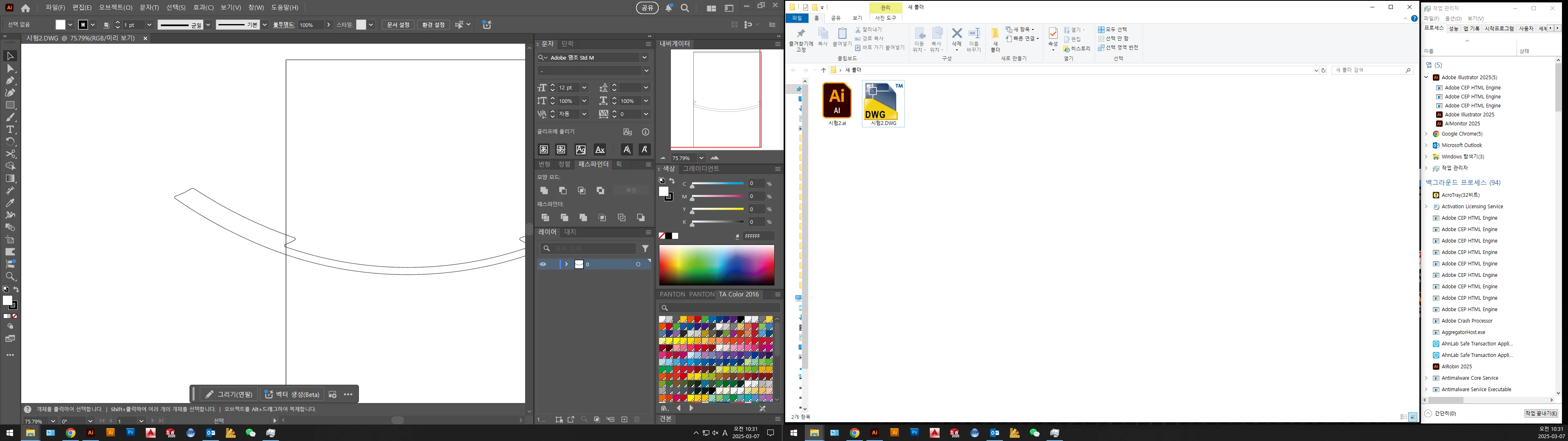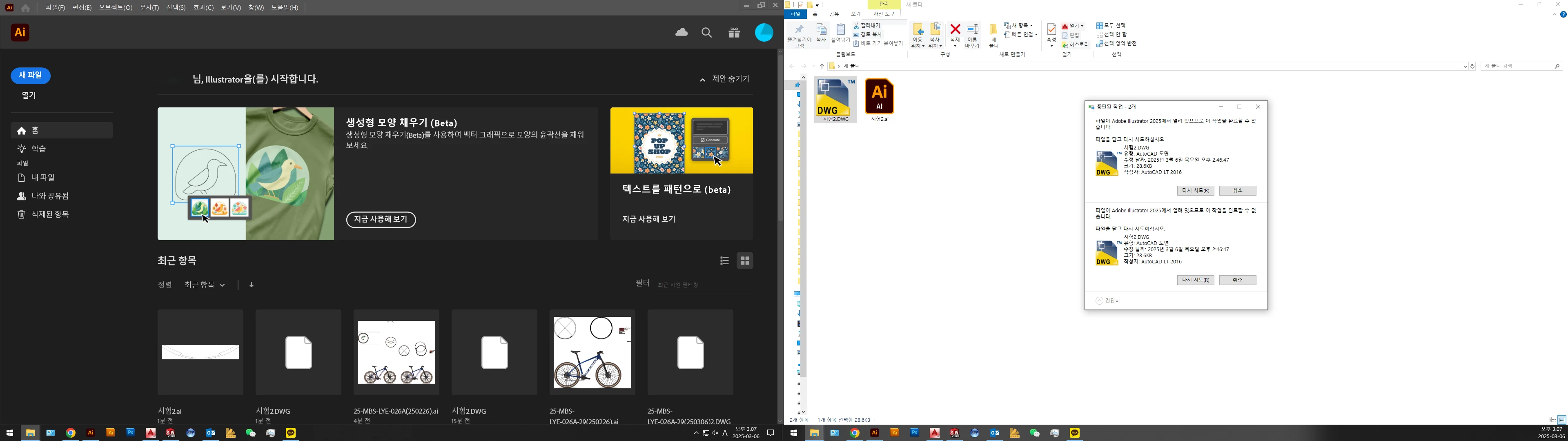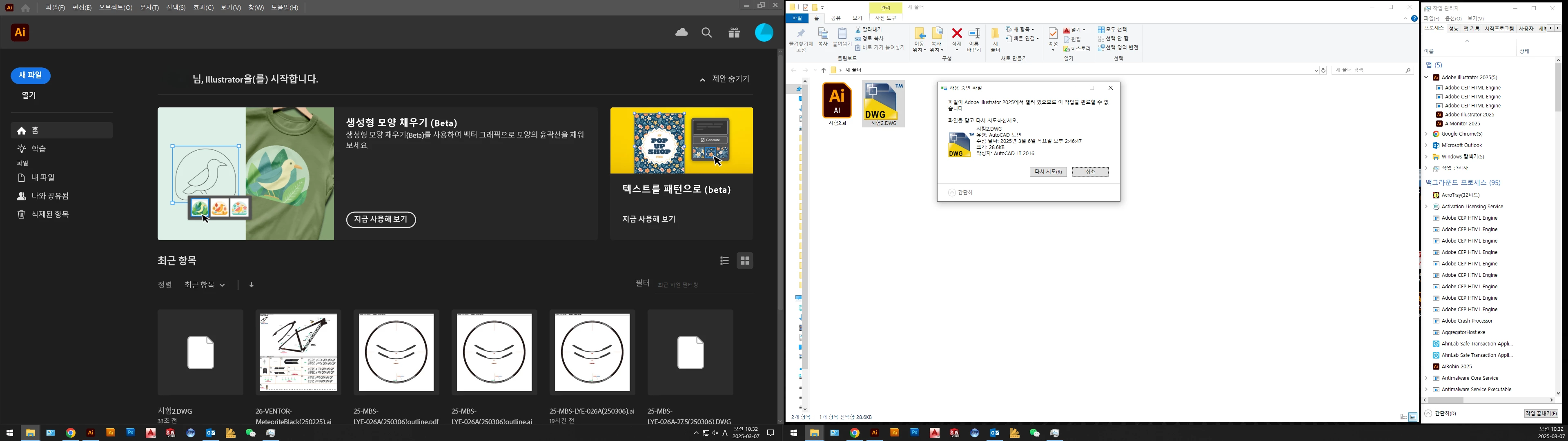 llustrator가 DWG 파일을 연 상태에서 해당 파일을 잠궈 두기 때문에, 다른 프로그램이나 같은 프로그램의 다른 인스턴스에서 다시 열 수 없게 됩니다. 작업관리자에서 백그라운드에 실행된 모든 일러스트 부분을 > 작업끝내기를 진행후에도 해당 DWG 파일을 수정할 수 없는게 맞나요?