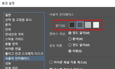 일러스트 > 편집 > 환경설정 > 사용자 인터페이스 > 밝기