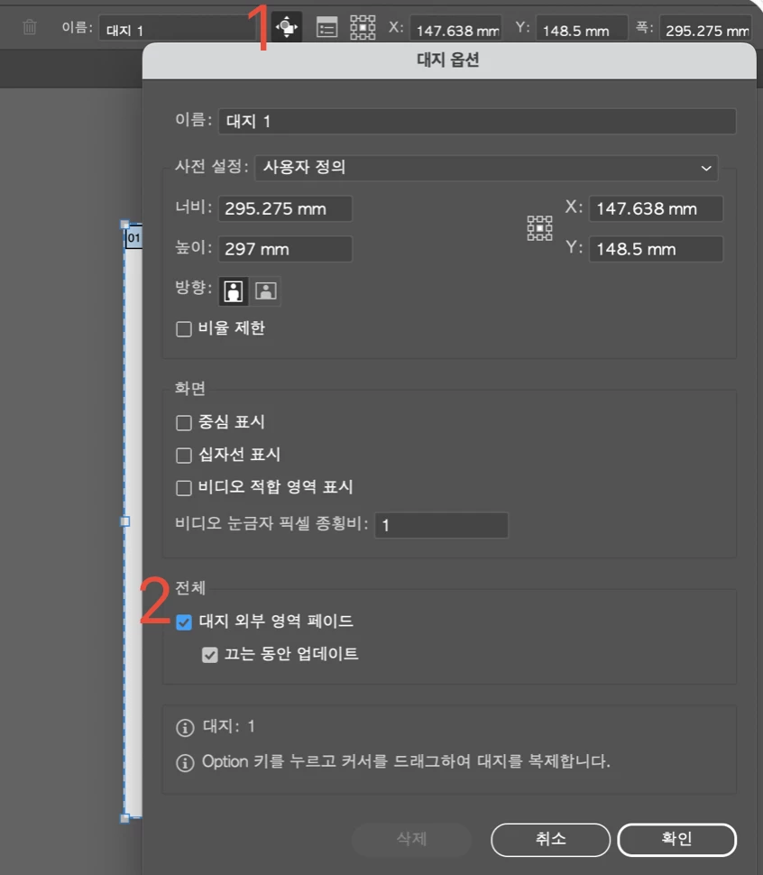 아래 '대지 외부 영역 페이드'  옵션 설정을 확인해주세요.