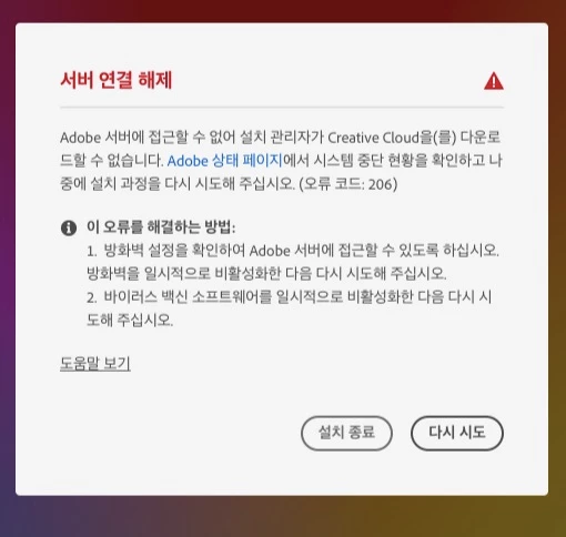사진은 크리에이티브 클라우드 어플 삭제후 다시 설치하려고 하니까 뜬 경고창입니다 ㅜㅜ