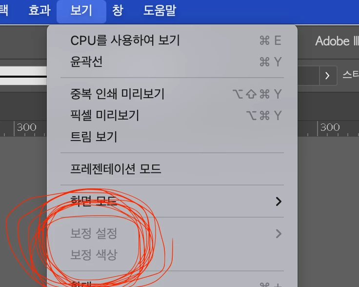 보기의 보정설정/보정색상이 눌리지 않습니다.
