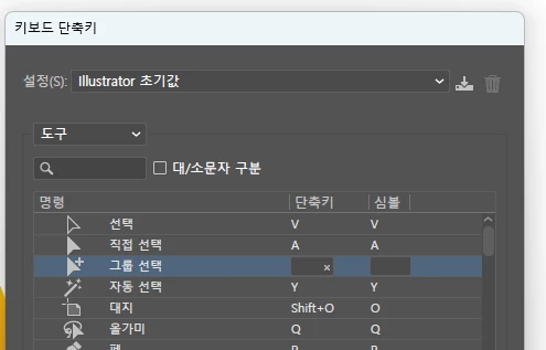 그룹 선택툴의 경우 기본적으로 별도의 단축키가 설정되어 있지 않습니다.