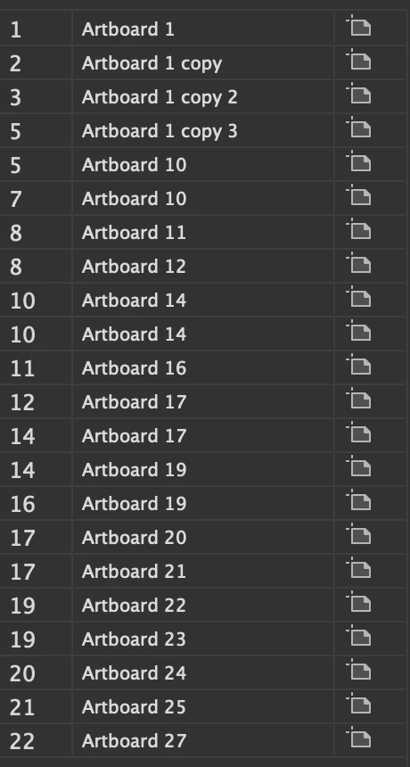 사진과 같이 아트보드의 번호가 누락되거나 중복되어 내보내기를 할 때에 중복된 아트보드가 정상적으로 내보내지지 않습니다.