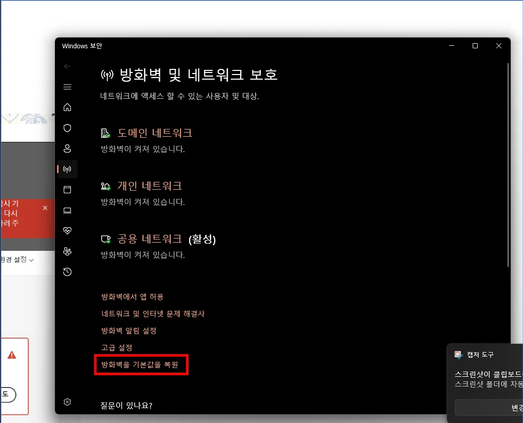 방화벽을 기본값을 복원을 누르면 초기화 할 수 있어요