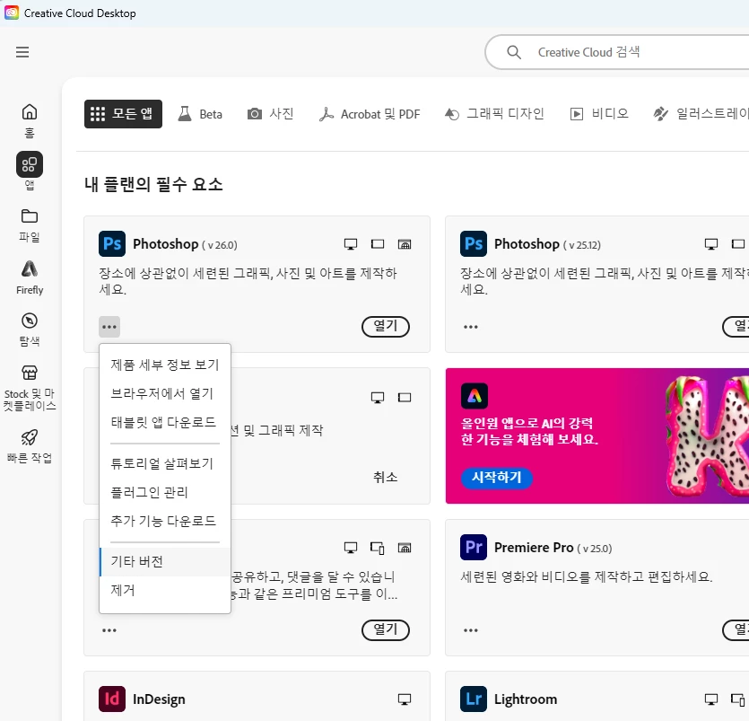 CC로 어도비 일러스트레이터를 사용하고 있는 사람입니다. 컴퓨터가 시스템 요구사항을 충족 못해서 28.x 버전을 다운로드받고 싶은데 CC에 접속해봐도 드롭다운 항목에 이전 버전 다운로드하기 항목이 뜨지를 않네요. 어떡하면 좋을까요