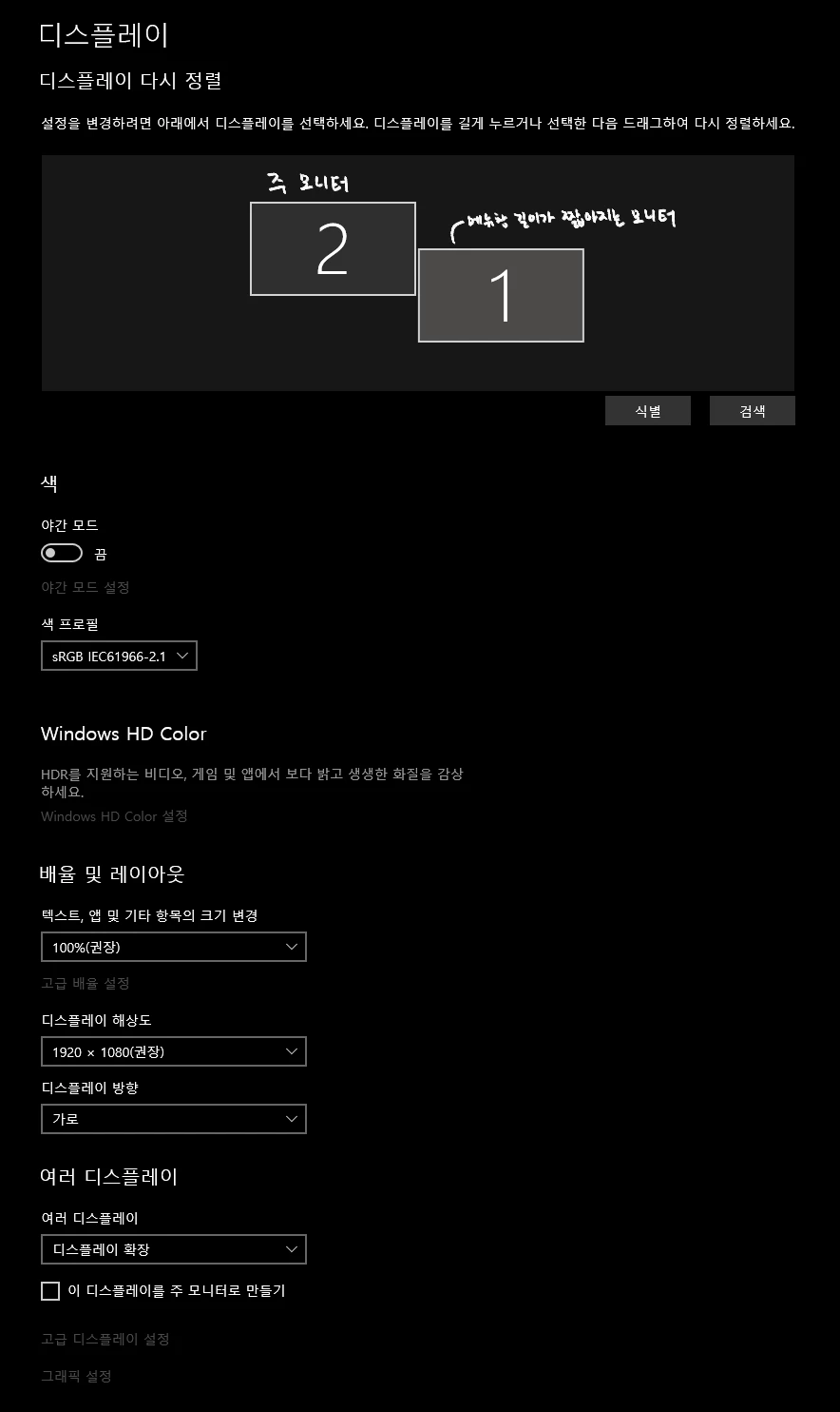 추가적으로 현재 설정하신 두 모니터의 해상도 및 배율을 확인해주시면
